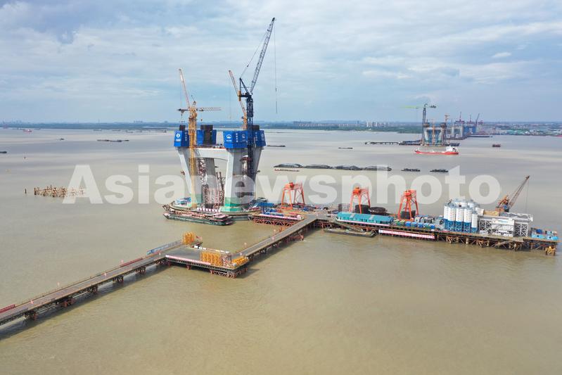 2022年6月22日,在江苏省常州市新北区拍摄的常泰长江大桥南主塔施工现场。