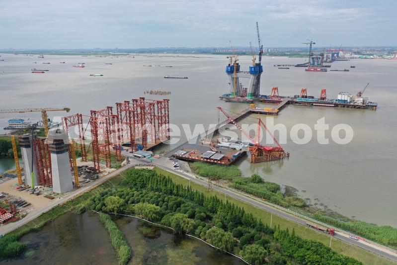 2022年6月22日,在江苏省常州市新北区拍摄的常泰长江大桥施工现场。