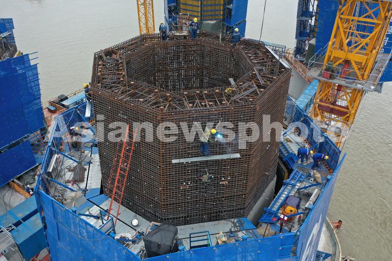2022年6月22日,工人在位于江苏省常州市新北区的常泰长江大桥南主塔上施工。