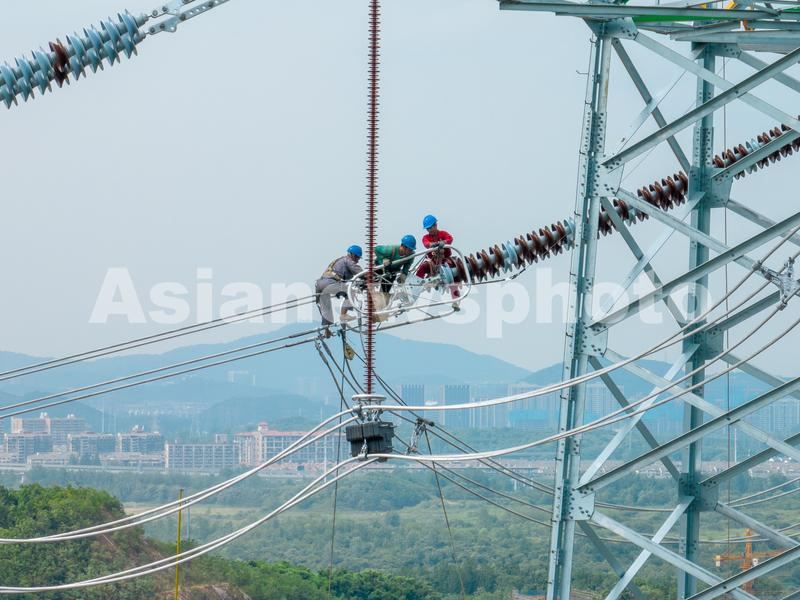 图片说明:6月23日,国网南京供电公司输电线路工人对南京青龙山500千伏输变电升压工程线路工程进行走线验收。