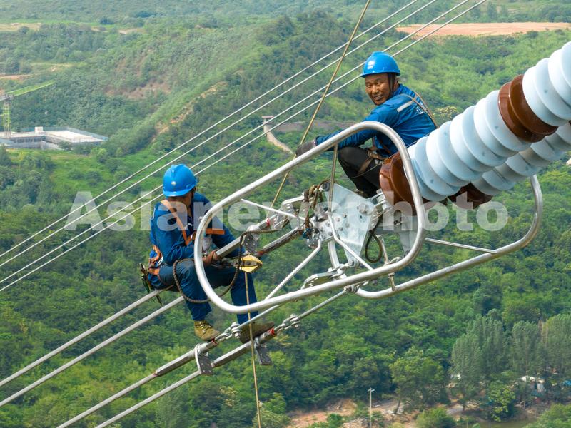 图片说明:6月23日,国网南京供电公司输电线路工人对南京青龙山500千伏输变电升压工程线路工程进行走线验收。