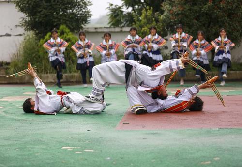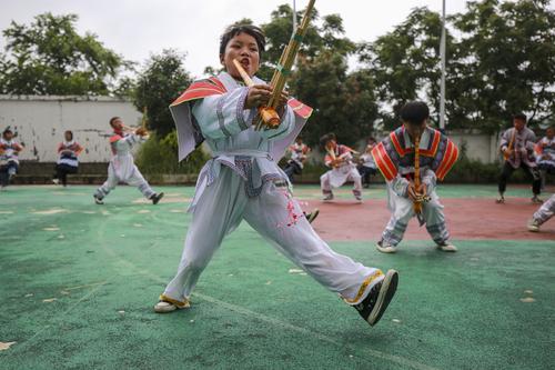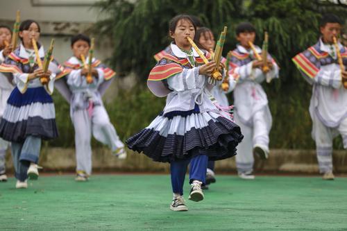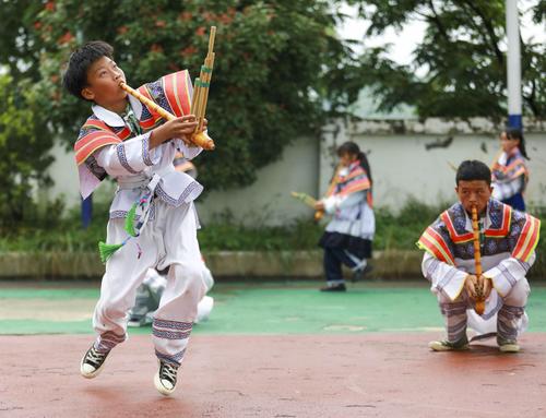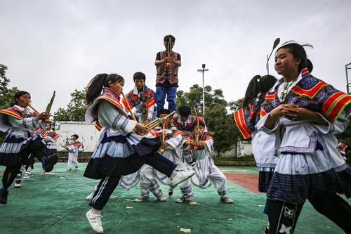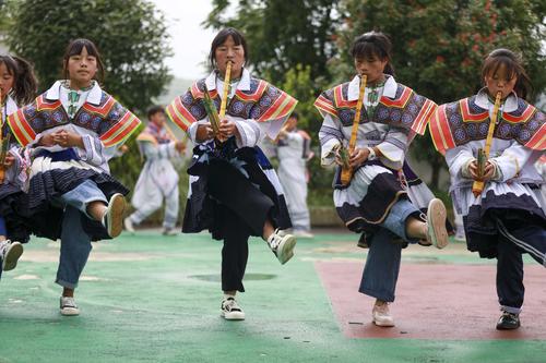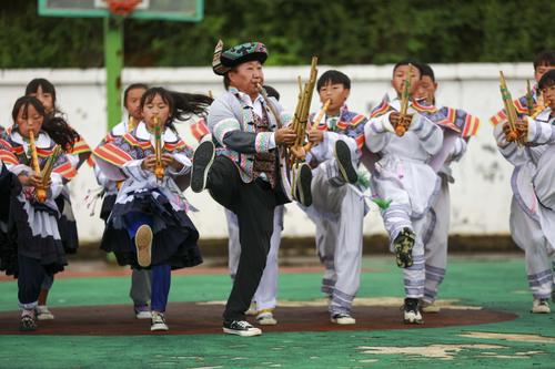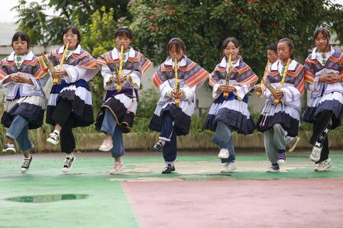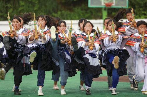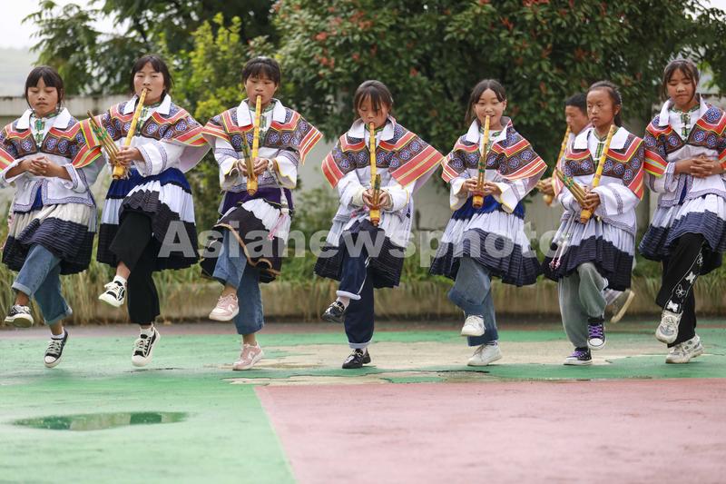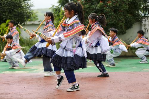 图片说明:2022年6月24日,在贵州省毕节市纳雍县锅圈岩苗族彝族乡锅圈岩中学的苗族学生在练习滚山珠芦笙舞。
