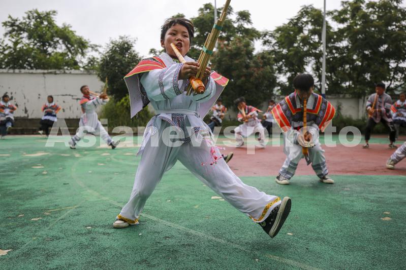 图片说明:2022年6月24日,在贵州省毕节市纳雍县锅圈岩苗族彝族乡锅圈岩中学的苗族学生在练习滚山珠芦笙舞。