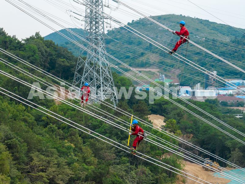 图片说明:6月23日,国网南京供电公司输电线路工人对南京青龙山500千伏输变电升压工程线路工程进行走线验收。
