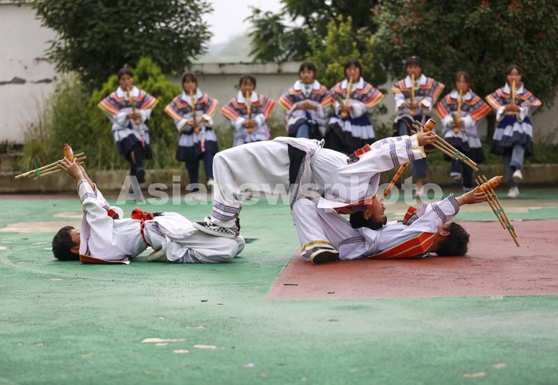 图片说明:2022年6月24日,在贵州省毕节市纳雍县锅圈岩苗族彝族乡锅圈岩中学的苗族学生在练习滚山珠芦笙舞。
