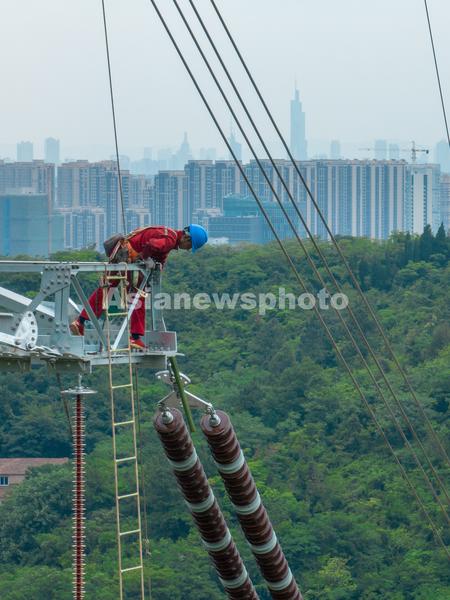 图片说明:6月23日,国网南京供电公司输电线路工人对南京青龙山500千伏输变电升压工程线路工程进行走线验收。