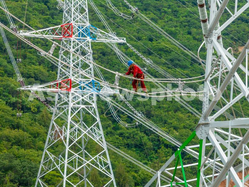 图片说明:6月23日,国网南京供电公司输电线路工人对南京青龙山500千伏输变电升压工程线路工程进行走线验收。