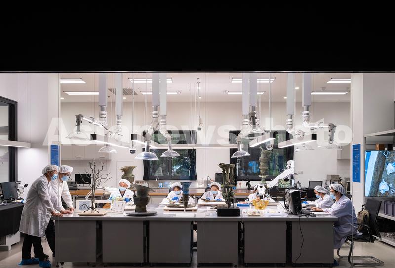 图片说明:2022年6月9日,在三星堆文物保护修复馆,文保人员在对三星堆遗址出土的器物进行修复。