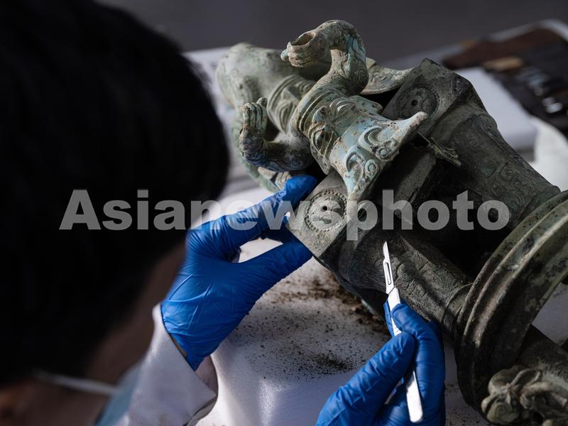 图片说明:2021年9月16日,文保人员在对三星堆遗址出土的顶坛人像进行修复。