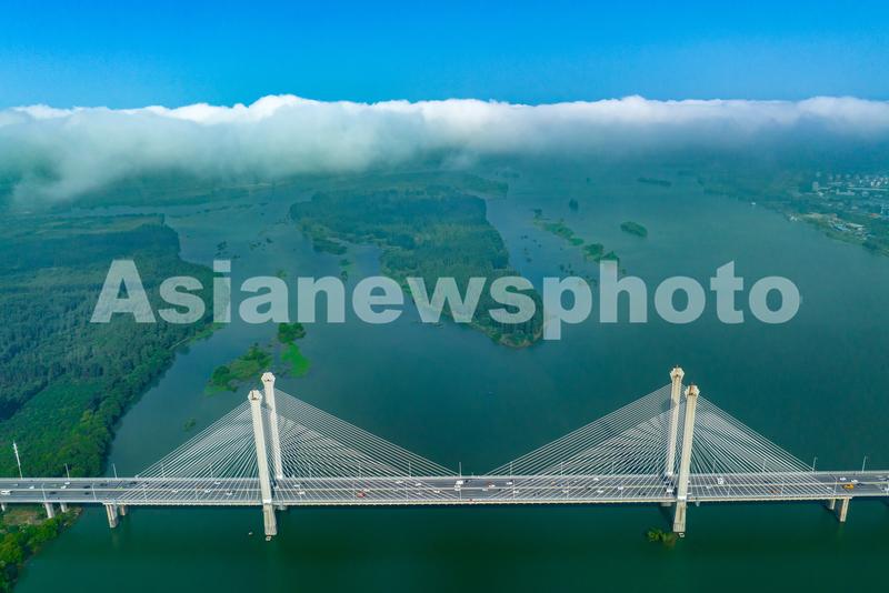 图片说明:2022年6月28日,湖北省襄阳市,雨后清晨的襄阳市汉江国家湿地公园,云雾在城市和汉江之上缭绕,景观迷人,宛如一幅美丽的生态画卷。