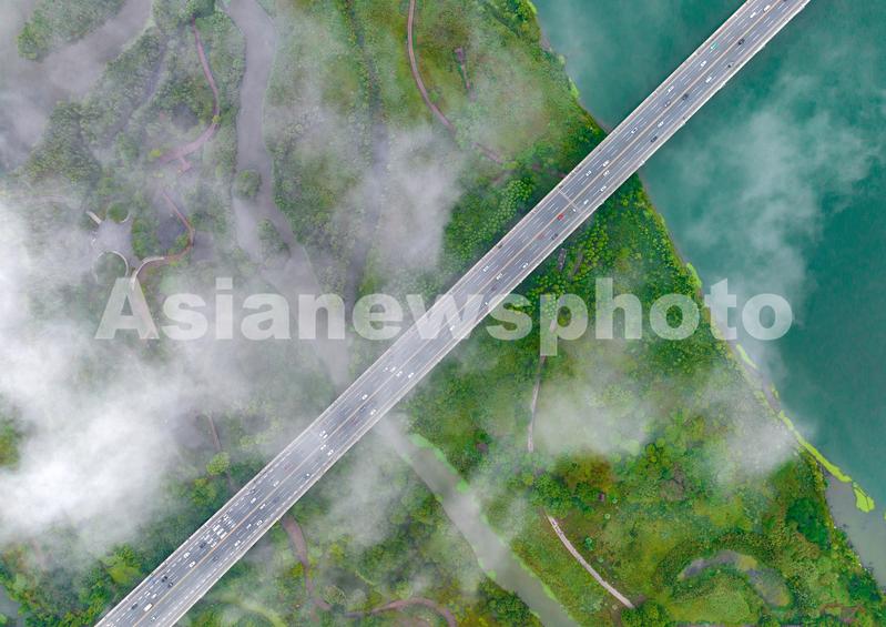 图片说明:2022年6月27日,湖北省襄阳市,雨后清晨的襄阳市汉江国家湿地公园,云雾在城市和汉江之上缭绕,景观迷人,宛如一幅美丽的生态画卷。