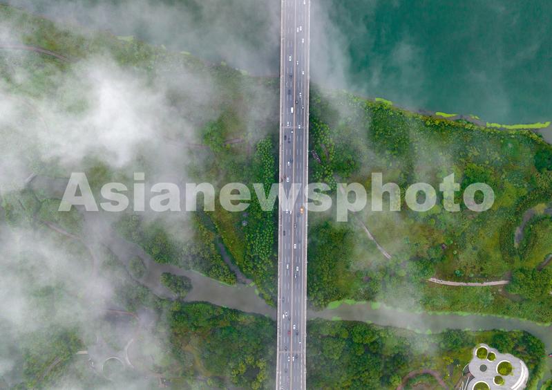 图片说明:2022年6月27日,湖北省襄阳市,雨后清晨的襄阳市汉江国家湿地公园,云雾在城市和汉江之上缭绕,景观迷人,宛如一幅美丽的生态画卷。