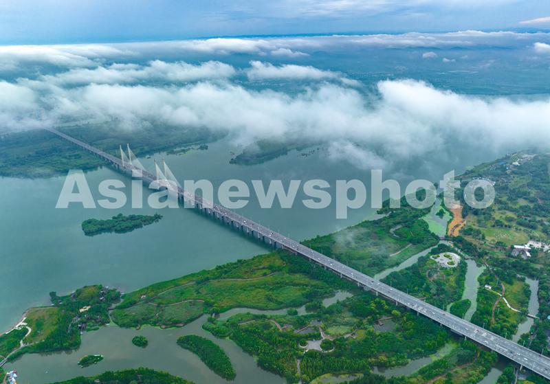 图片说明:2022年6月27日,湖北省襄阳市,雨后清晨的襄阳市汉江国家湿地公园,云雾在城市和汉江之上缭绕,景观迷人,宛如一幅美丽的生态画卷。