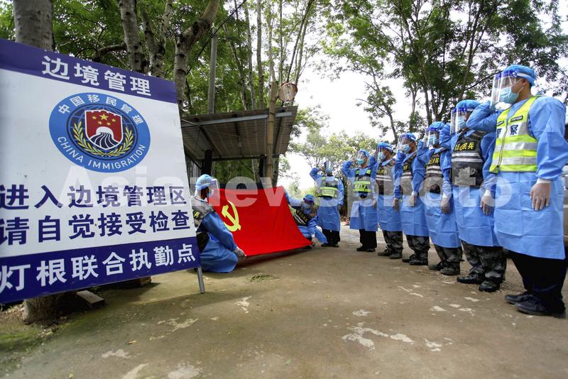 图片说明:2022年6月28日,云南普洱边境管理支队芒信边境派出所党员民警和民兵在灯根联合执勤点重温入党誓词。