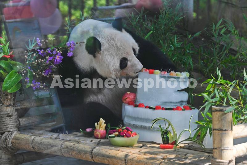 图片说明:2022年6月27日,广西南宁市动物园举办大熊猫生日会,为龙凤双胞胎大熊猫“绩美”“绩兰”庆祝6岁生日。生日会现场,熊猫品尝由竹叶、西瓜、苹果、草莓等食物及冰块组成的特制消暑“蛋糕”。