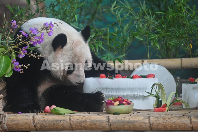 图片说明:2022年6月27日,广西南宁市动物园举办大熊猫生日会,为龙凤双胞胎大熊猫“绩美”“绩兰”庆祝6岁生日。生日会现场,熊猫品尝由竹叶、西瓜、苹果、草莓等食物及冰块组成的特制消暑“蛋糕”。