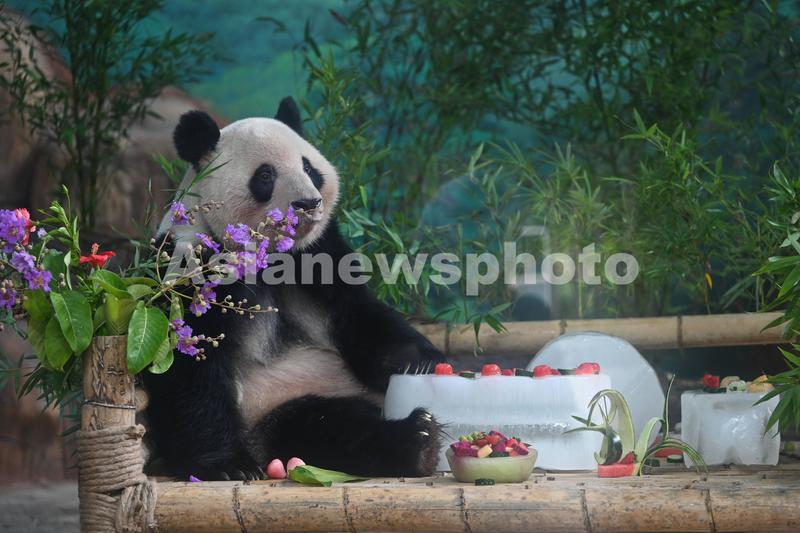 图片说明:2022年6月27日,广西南宁市动物园举办大熊猫生日会,为龙凤双胞胎大熊猫“绩美”“绩兰”庆祝6岁生日。生日会现场,熊猫品尝由竹叶、西瓜、苹果、草莓等食物及冰块组成的特制消暑“蛋糕”。