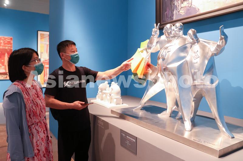 2022年6月30日,观众在中国国家博物馆举行的“笔墨丹青绘湾区——庆祝香港回归祖国25周年美术作品展”上观看雕塑《广交会—来自世界的笑脸》。