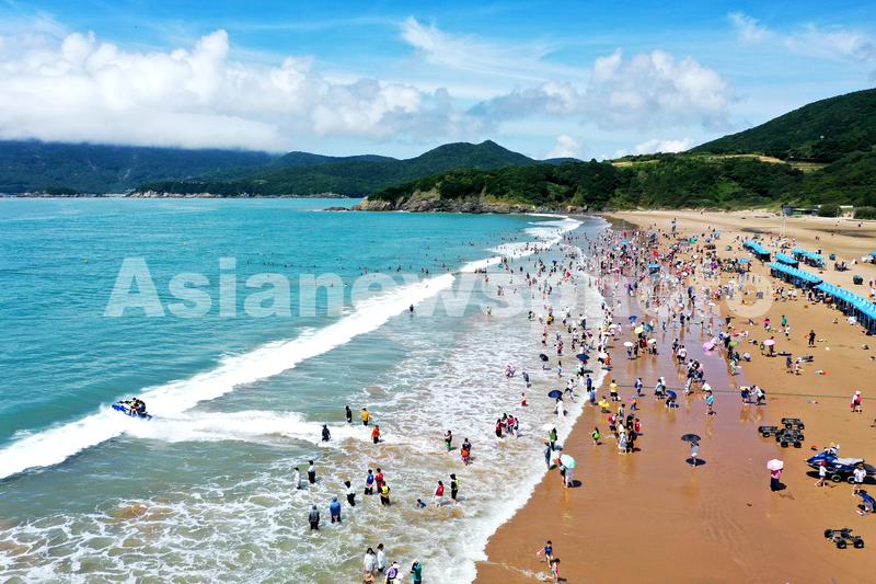 图片说明:2022年7月3日,来自市内外的游客在浙江省舟山市普陀区朱家尖南沙海滩戏水弄潮、骑摩托艇冲浪等,尽情地享受海中的清凉。