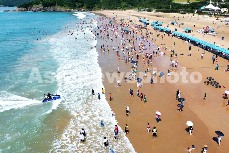 图片说明:2022年7月3日,来自市内外的游客在浙江省舟山市普陀区朱家尖南沙海滩戏水弄潮、骑摩托艇冲浪等,尽情地享受海中的清凉。