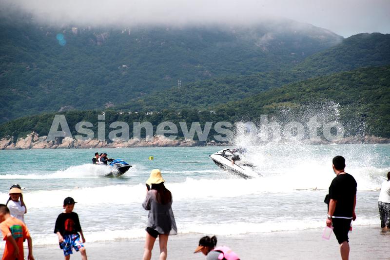 图片说明:2022年7月3日,来自市内外的游客在浙江省舟山市普陀区朱家尖南沙海滩戏水弄潮、骑摩托艇冲浪等,尽情地享受海中的清凉。