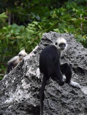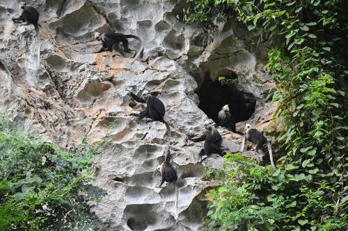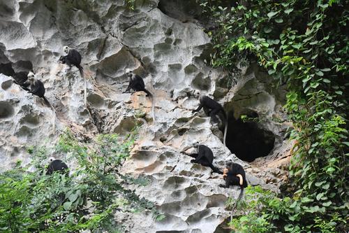 2022年7月3日,在群山连绵,植被茂密的广西壮族自治区崇左市白头叶猴国家级自然保护区(板利片区)生态旅游区,不少野生白头叶猴在树上、岩石上玩耍或采食树叶,其动作轻盈灵巧、情趣盎然,令不少游客大饱眼福。