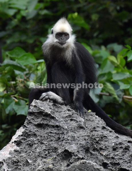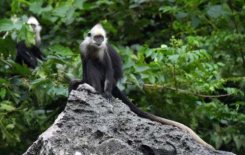 7月3日,在广西壮族自治区崇左市白头叶猴国家级自然保护区(板利片区)生态旅游区,野生白头叶猴在岩石上小憩。