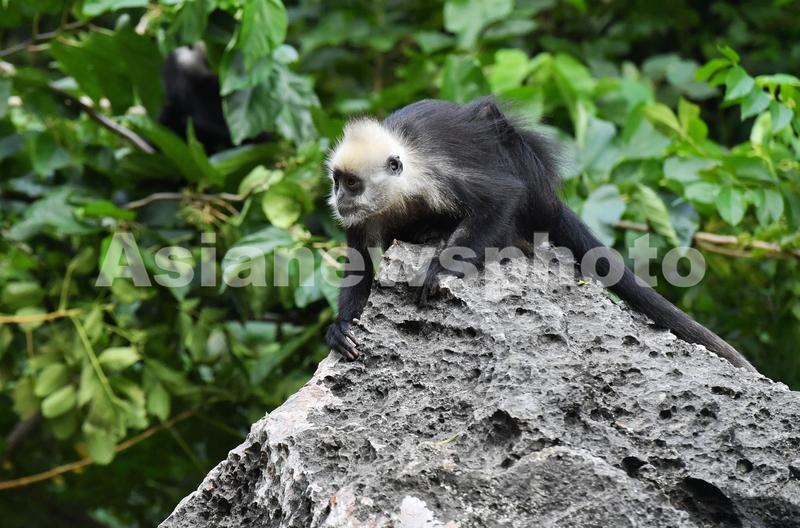 7月3日,在广西壮族自治区崇左市白头叶猴国家级自然保护区(板利片区)生态旅游区,野生白头叶猴在岩石上小憩。