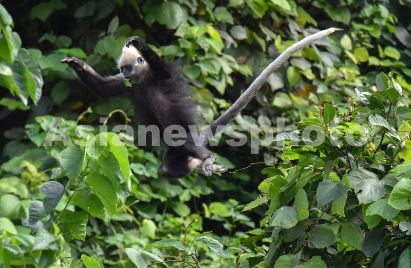 7月3日,在广西壮族自治区崇左市白头叶猴国家级自然保护区(板利片区)生态旅游区,野生白头叶猴在灌木丛中跳跃。