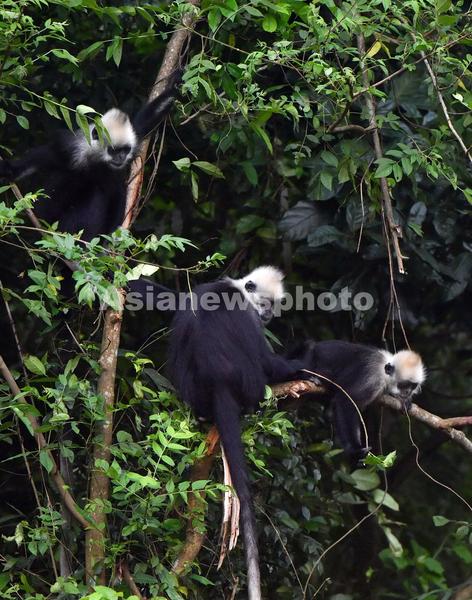 2022年7月3日,在群山连绵,植被茂密的广西壮族自治区崇左市白头叶猴国家级自然保护区(板利片区)生态旅游区,不少野生白头叶猴在树上、岩石上玩耍或采食树叶,其动作轻盈灵巧、情趣盎然,令不少游客大饱眼福。