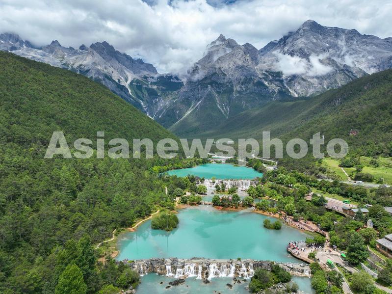 2022年7月5日,游客在玉龙雪山脚下的蓝月谷游览(无人机照片)。