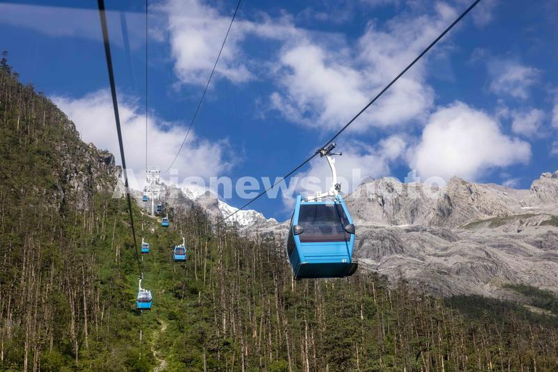 2022年7月5日,游客在玉龙雪山景区乘坐索道缆车游览。