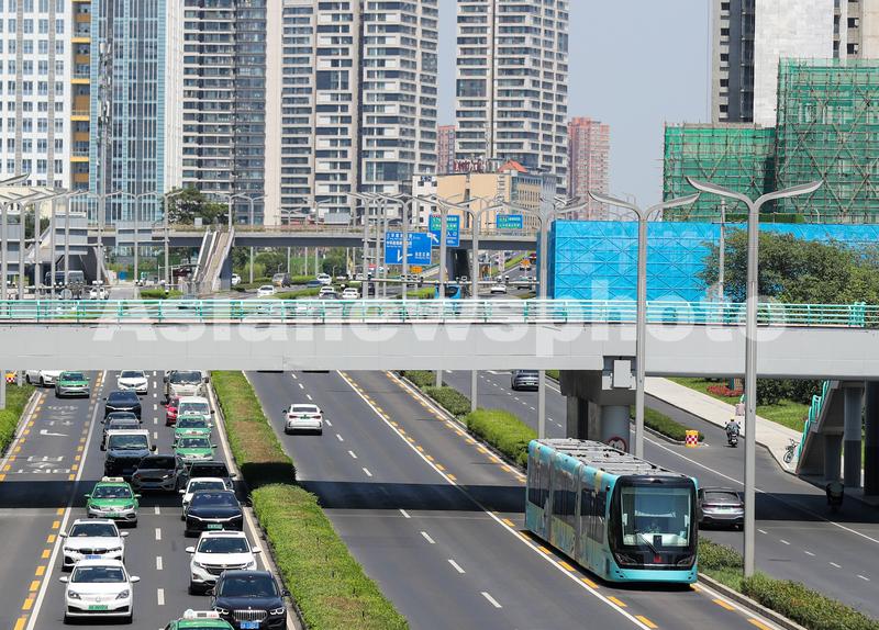 图片说明:2022年7月6日,四川省宜宾市制造的智轨电车“蜀都号”和“天府号”在成都市载客试跑,不少市民前来体验感受新的出行方式。