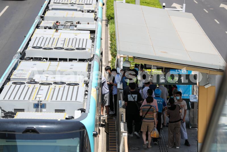 图片说明:2022年7月6日,四川省宜宾市制造的智轨电车“蜀都号”和“天府号”在成都市载客试跑,不少市民前来体验感受新的出行方式。