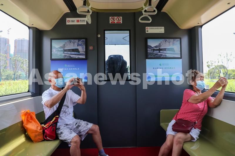 图片说明:2022年7月6日,四川省宜宾市制造的智轨电车“蜀都号”和“天府号”在成都市载客试跑,不少市民前来体验感受新的出行方式。