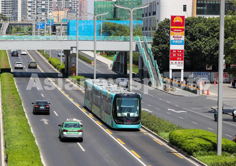 图片说明:2022年7月6日,四川省宜宾市制造的智轨电车“蜀都号”和“天府号”在成都市载客试跑,不少市民前来体验感受新的出行方式。