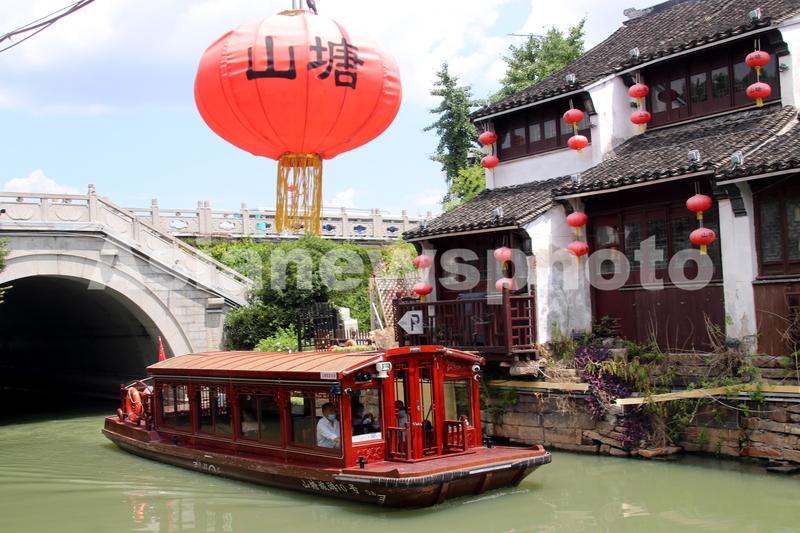 2022年7月12日,游客乘坐仿古游船游览江苏苏州山塘街水巷。当日,江苏苏州持续高温,颇具江南水乡特色的“姑苏水上游”特色旅游项目成为许多游客消夏避暑的好选择。游客乘船饱览姑苏“小桥、流水、人家”美景别有一番意境。