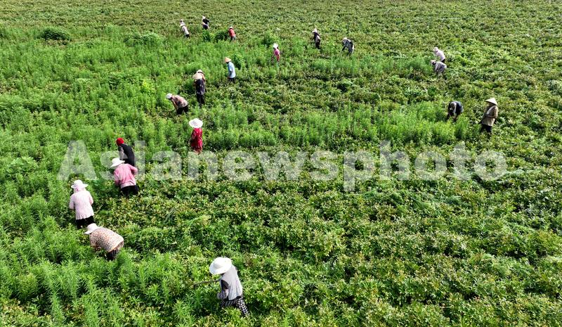 图片说明:7月11日,在安徽省亳州市谯城区十八里镇蒋李村,药农冒着高温在中药材白芍地里进行除草。