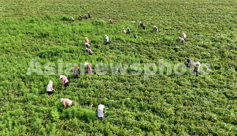 图片说明:7月11日,在安徽省亳州市谯城区十八里镇蒋李村,药农冒着高温在中药材白芍地里进行除草。