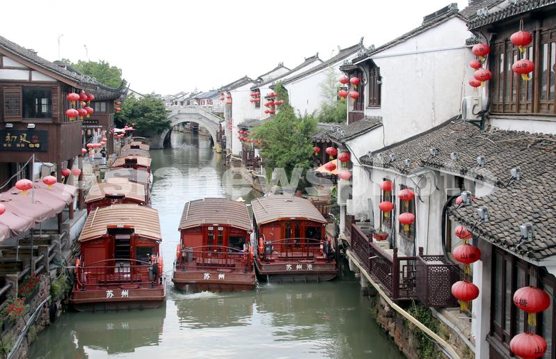 2022年7月12日,游客乘坐仿古游船游览江苏苏州山塘街水巷。当日,江苏苏州持续高温,颇具江南水乡特色的“姑苏水上游”特色旅游项目成为许多游客消夏避暑的好选择。游客乘船饱览姑苏“小桥、流水、人家”美景别有一番意境。
