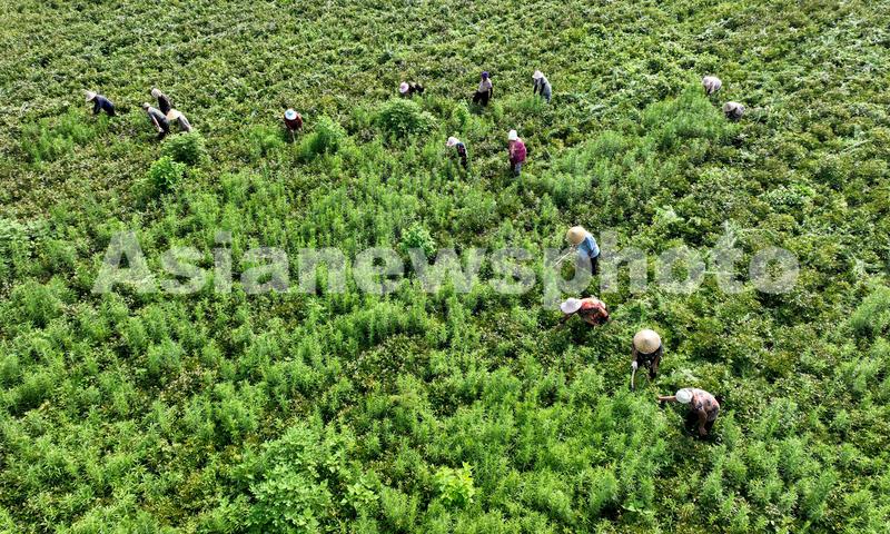 图片说明:7月11日,在安徽省亳州市谯城区十八里镇蒋李村,药农冒着高温在中药材白芍地里进行除草。