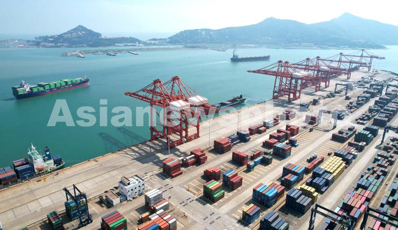 图片说明:2022年7月13日,两艘货轮缓缓驶离江苏连云港港集装箱码头。