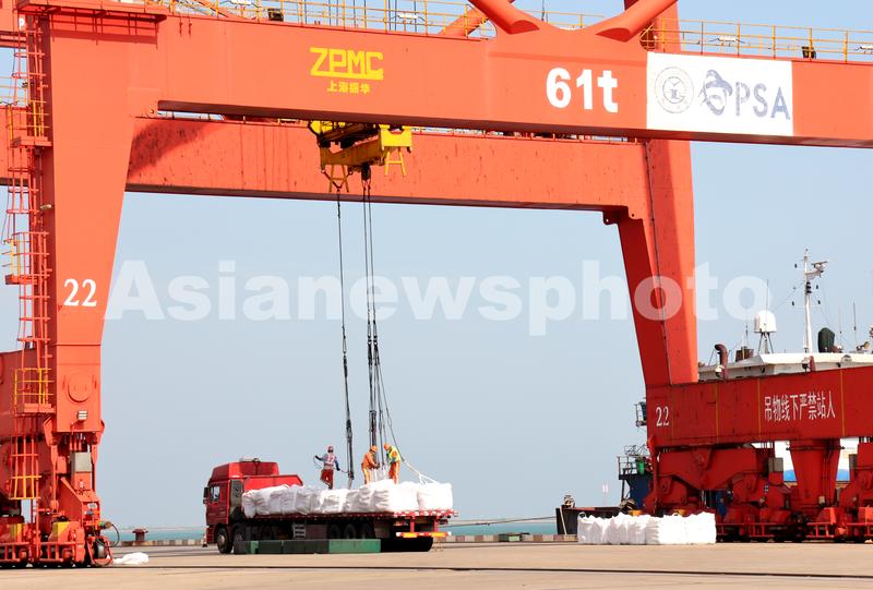 图片说明:2022年7月13日,货轮在江苏连云港港码头装卸货物。