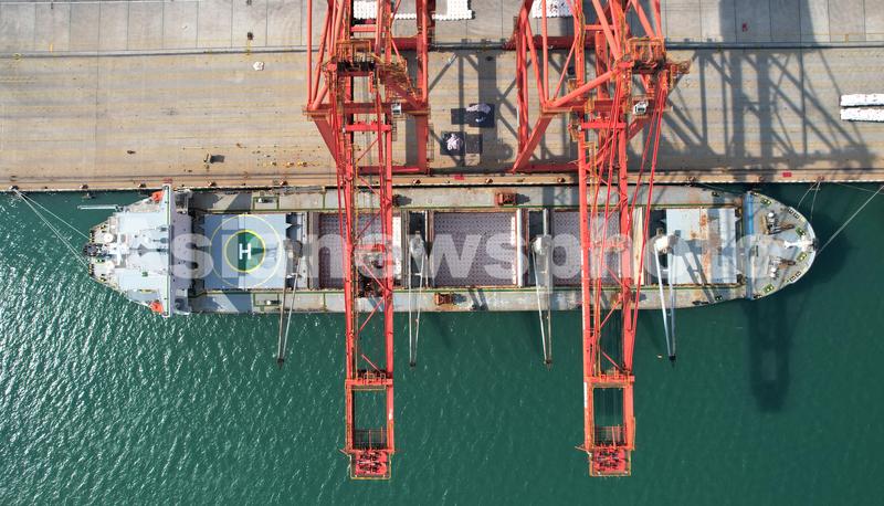 图片说明:2022年7月13日,货轮在江苏连云港港码头装卸货物。