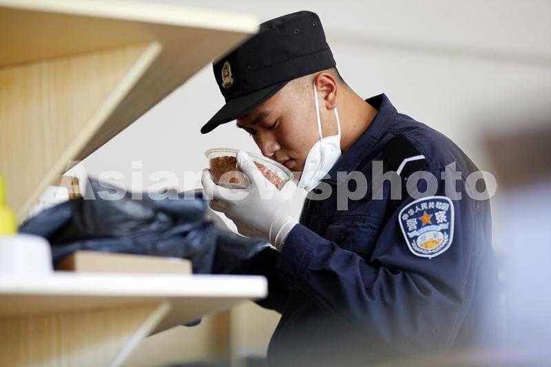 2022年7月14日,云南普洱边境管理支队芒信边境派出所民警陈小军携缉毒犬对快递物流收发点开展突击检查,缉毒犬通过嗅识、嗅辨排查是否有违禁物品。
