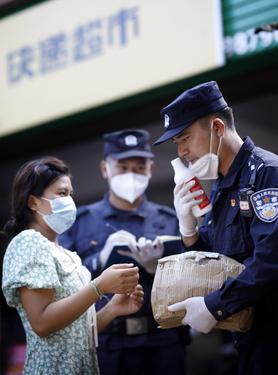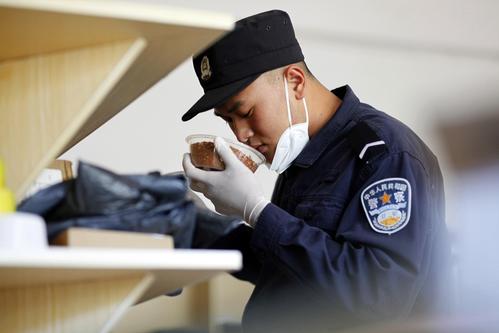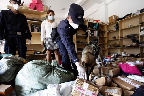 2022年7月14日,云南普洱边境管理支队芒信边境派出所民警陈小军携缉毒犬对快递物流收发点开展突击检查,缉毒犬通过嗅识、嗅辨排查是否有违禁物品。