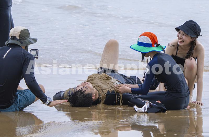 图片说明:7月14日,在海南万宁日月湾,游客在沙滩上玩耍。