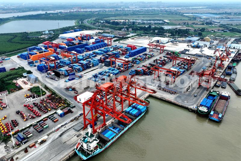 2022年7月15日,在位于江苏省如皋市长江镇境内的如皋港苏中国际码头,机械进行吊装作业,作业区呈现一片繁忙景象。