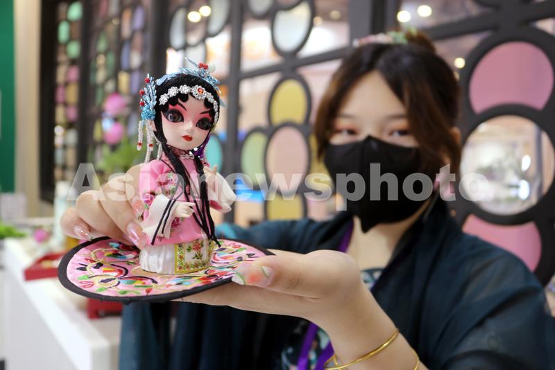 2022年7月15日,在第十一届中国苏州文博会上,工作人员在展示面塑昆曲人物作品。