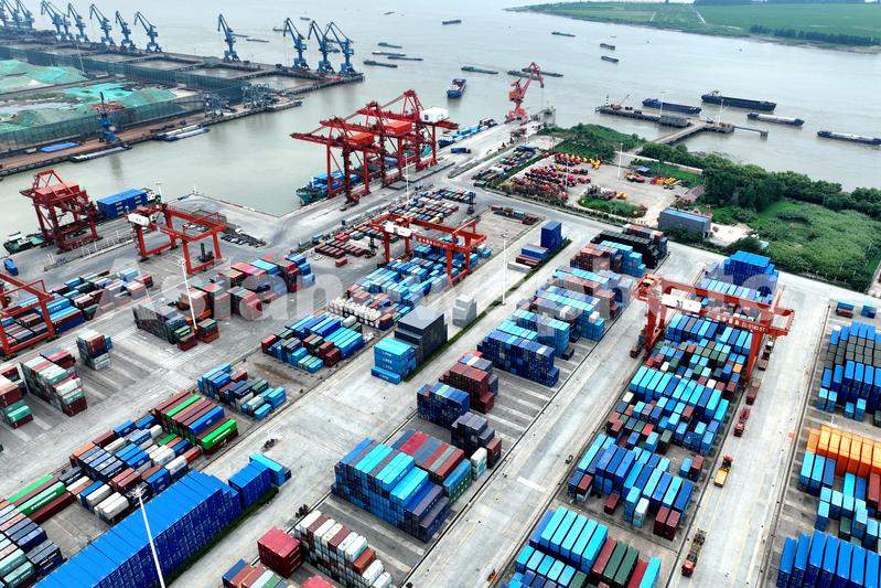 2022年7月15日,在位于江苏省如皋市长江镇境内的如皋港苏中国际码头,机械进行吊装作业,作业区呈现一片繁忙景象。